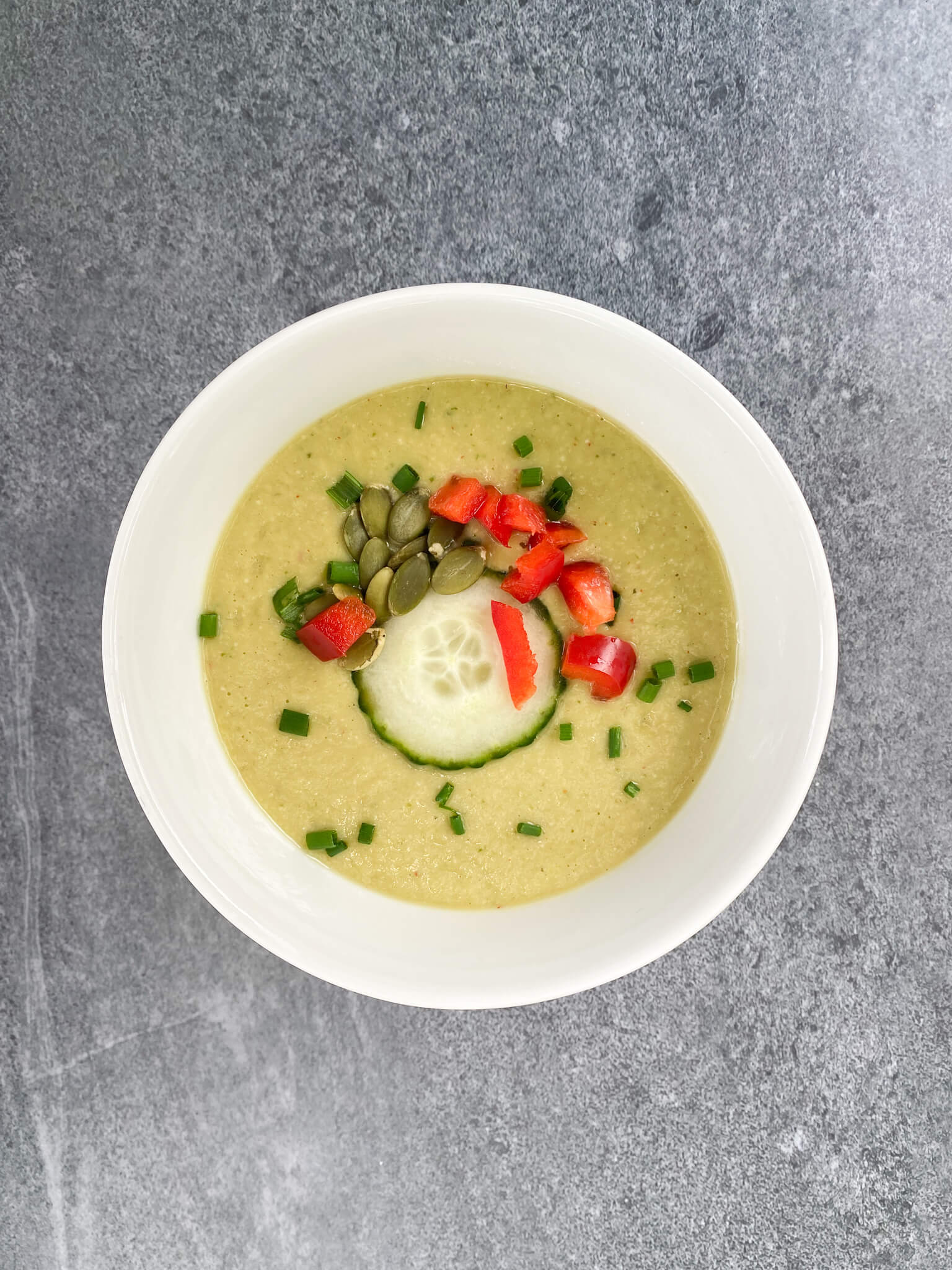 This light, cool soup hits the spot on a hot day! Blended soups are so great in that it really doesn’t matter how nicely you chop your ingredients – they’re just going to get pureed anyways! This is a really easy soup that comes together very quickly. It can be served in bowls or even in cute, little cups and sipped as an appetizer.